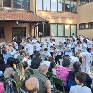 Nel finale, invece, ad un segnale prestabilito di Franco, i ragazzi hanno iniziato a lanciare carta di giornale appallottolata, coinvolgendo anche il pubblico e gli insegnanti presenti.